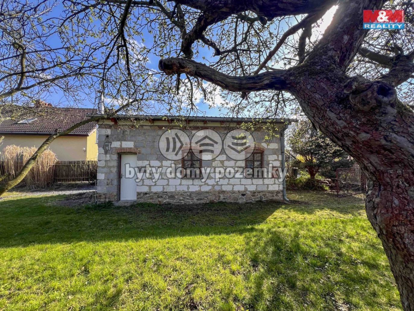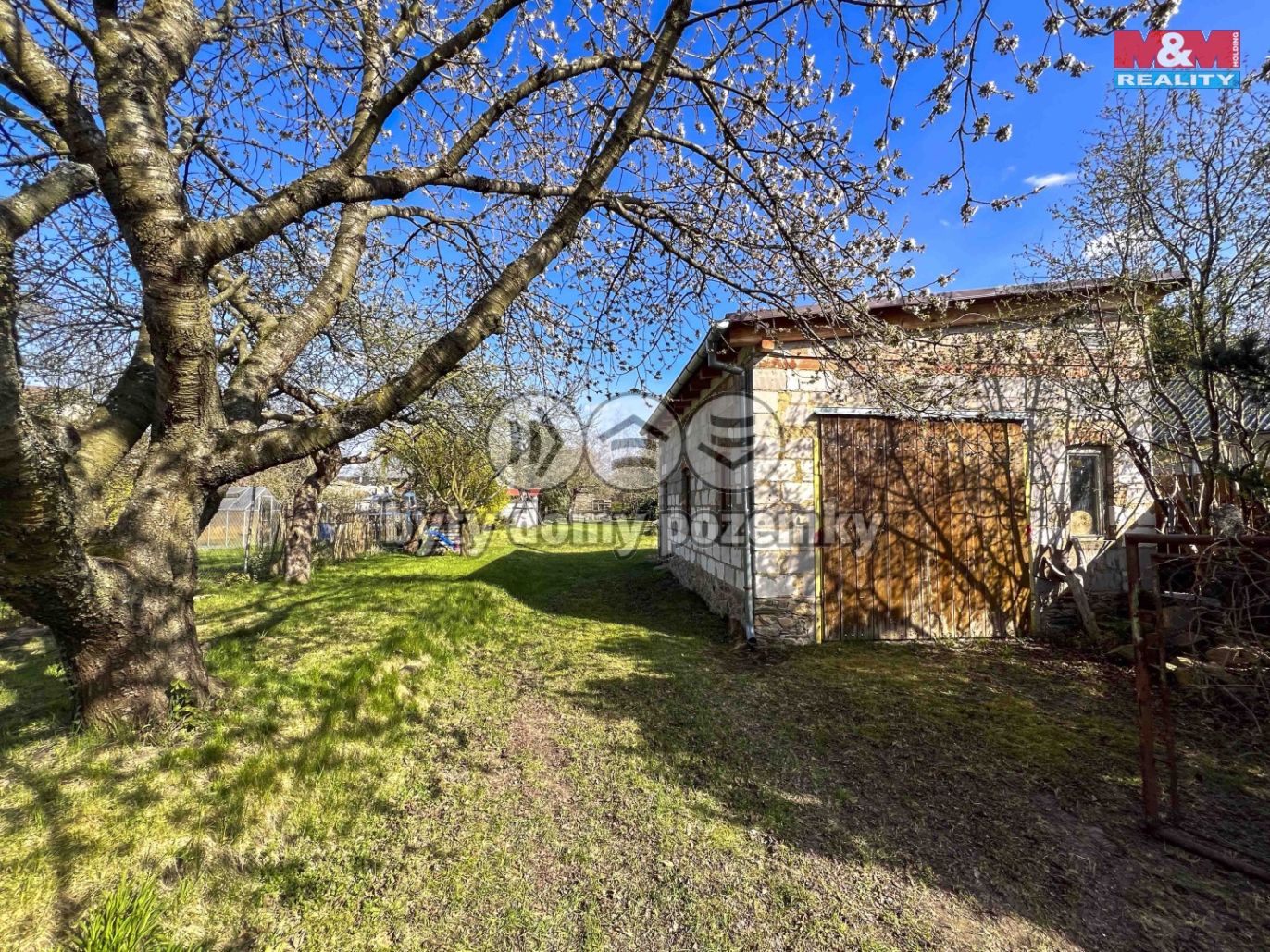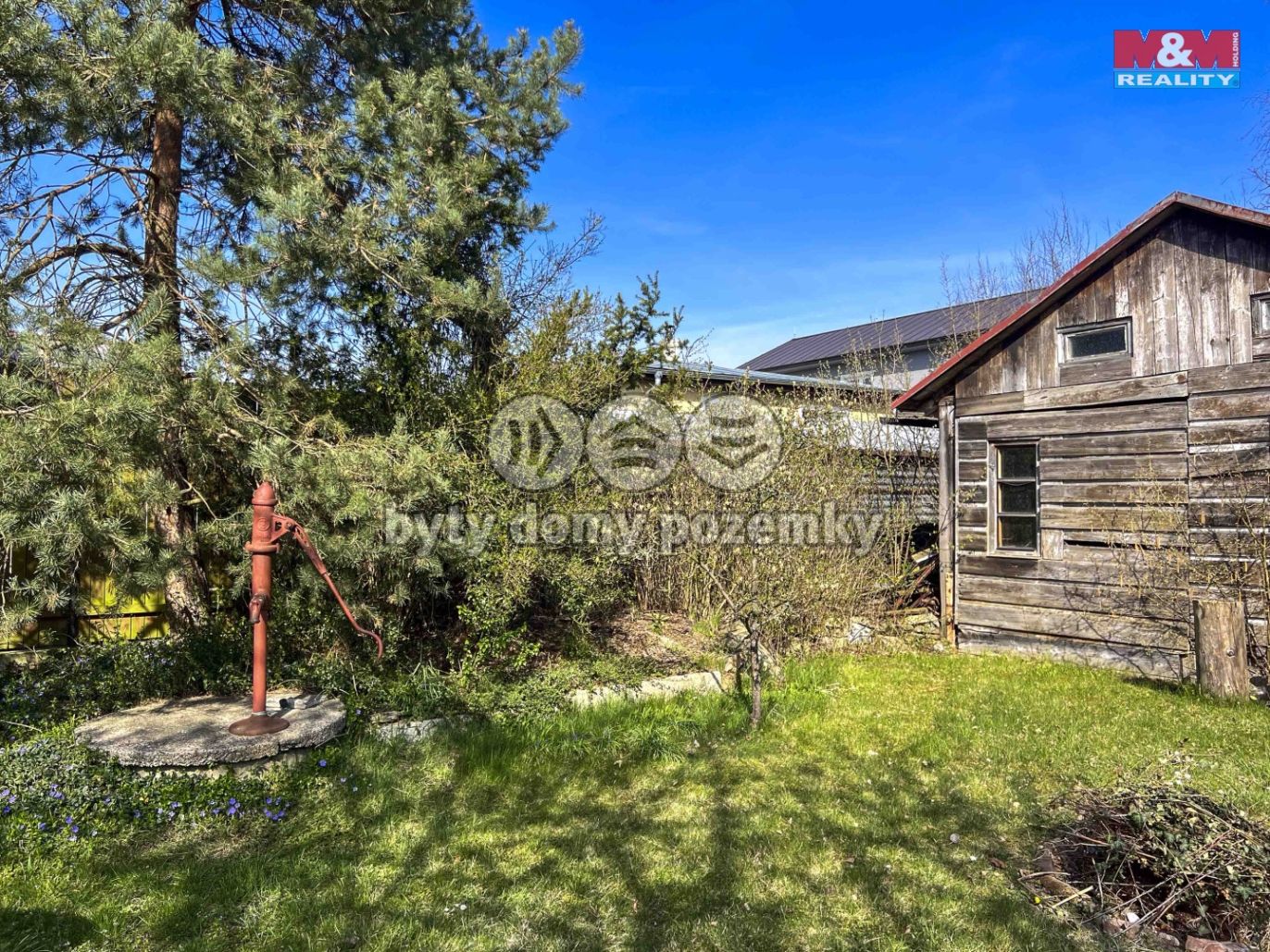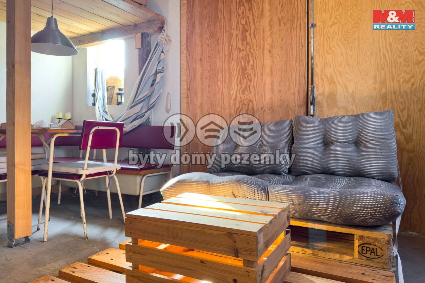Součástí pozemku je zděná stavba o velikosti 42 m², která slouží jako víkendový domek s dřevěným patrem. Má zavedenou vodu a vytápění kamny, takže může posloužit jako dočasné bydlení během stavby nebo jako rekreační objekt.