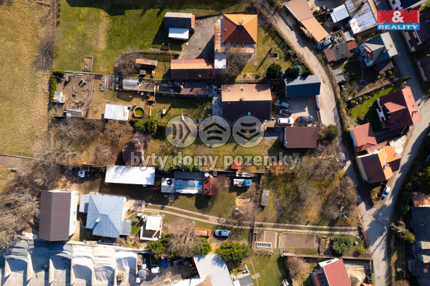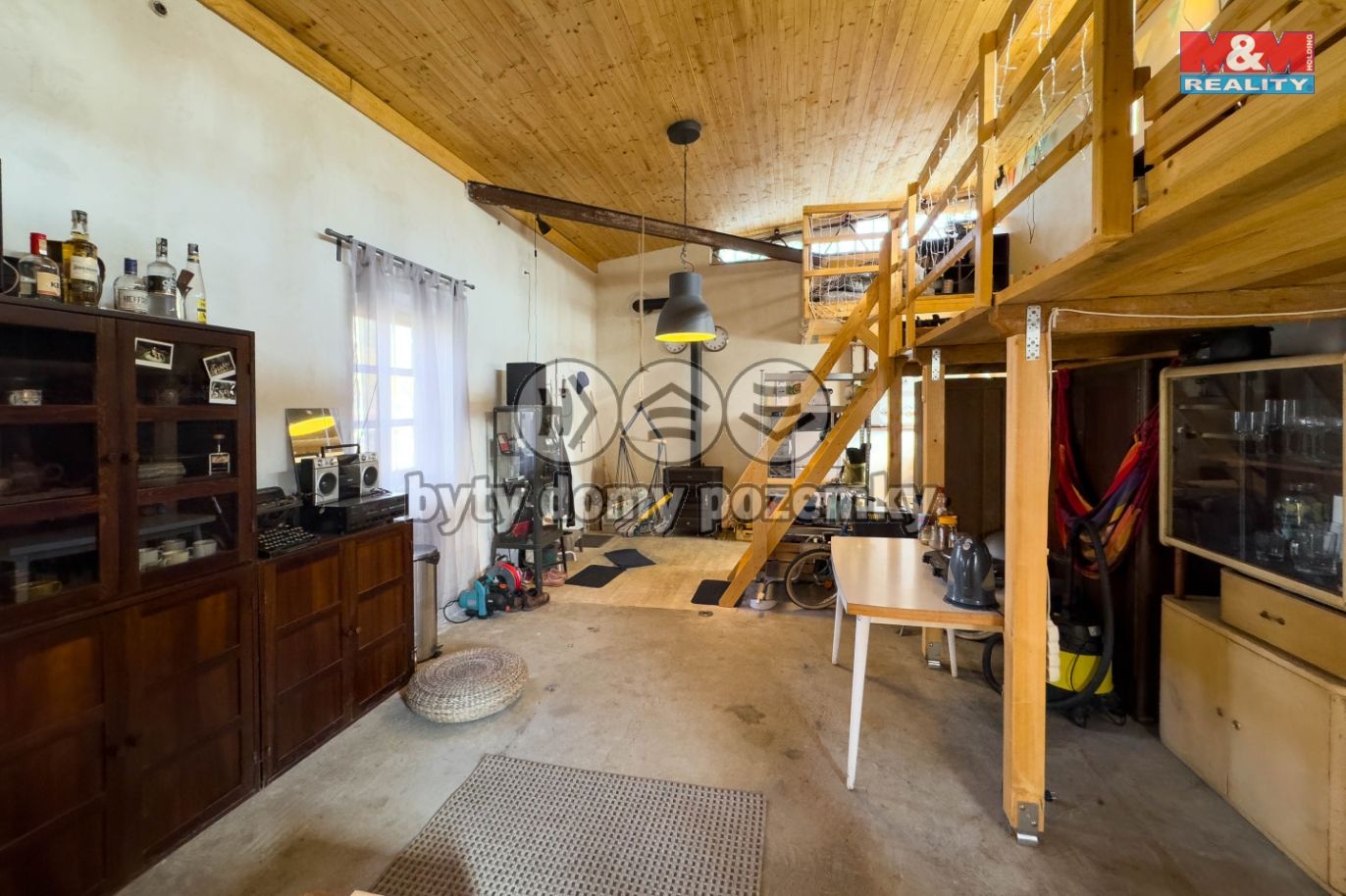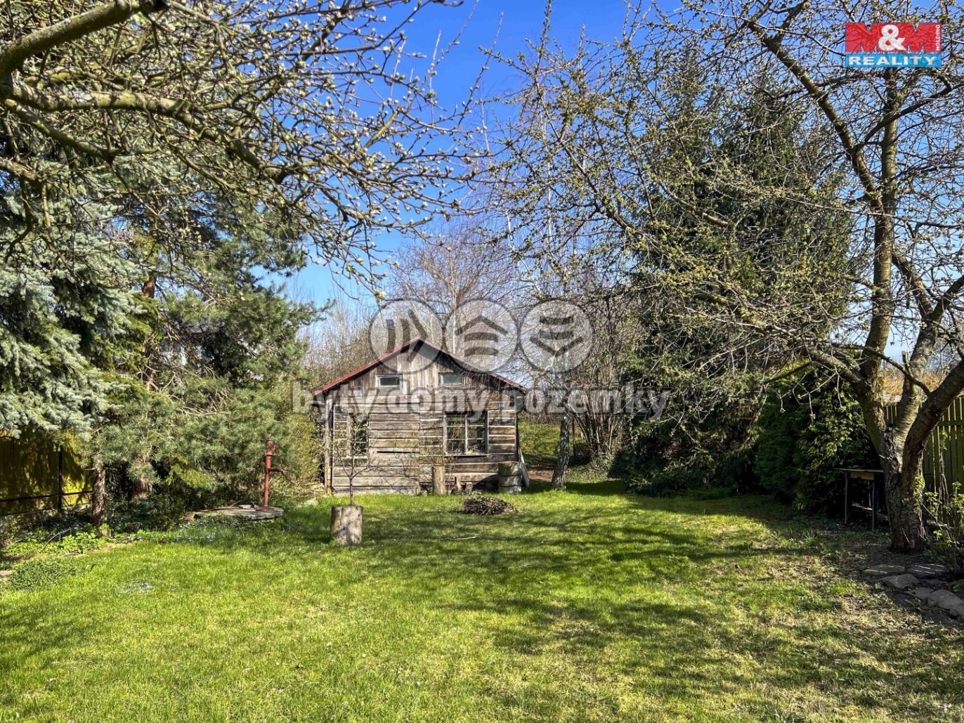 Součástí pozemku je zděná stavba o velikosti 42 m², která slouží jako víkendový domek s dřevěným patrem. Má zavedenou vodu a vytápění kamny, takže může posloužit jako dočasné bydlení během stavby nebo jako rekreační objekt.
