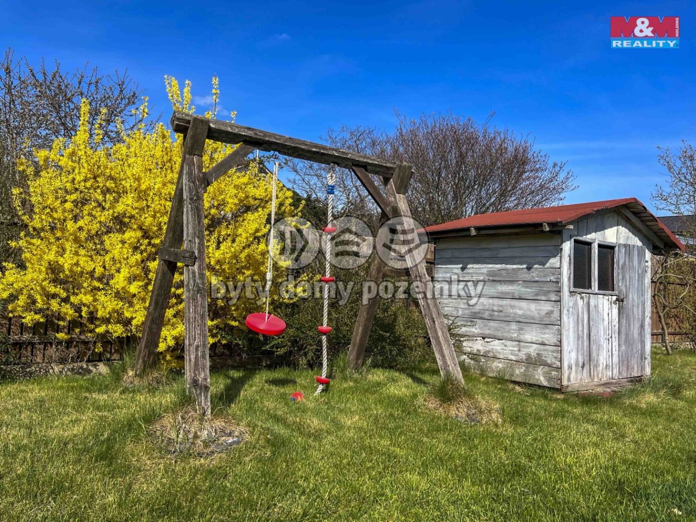 V zadní části najdete také praktický dřevěný domek pro uskladnění materiálu a malou kůlnu.
